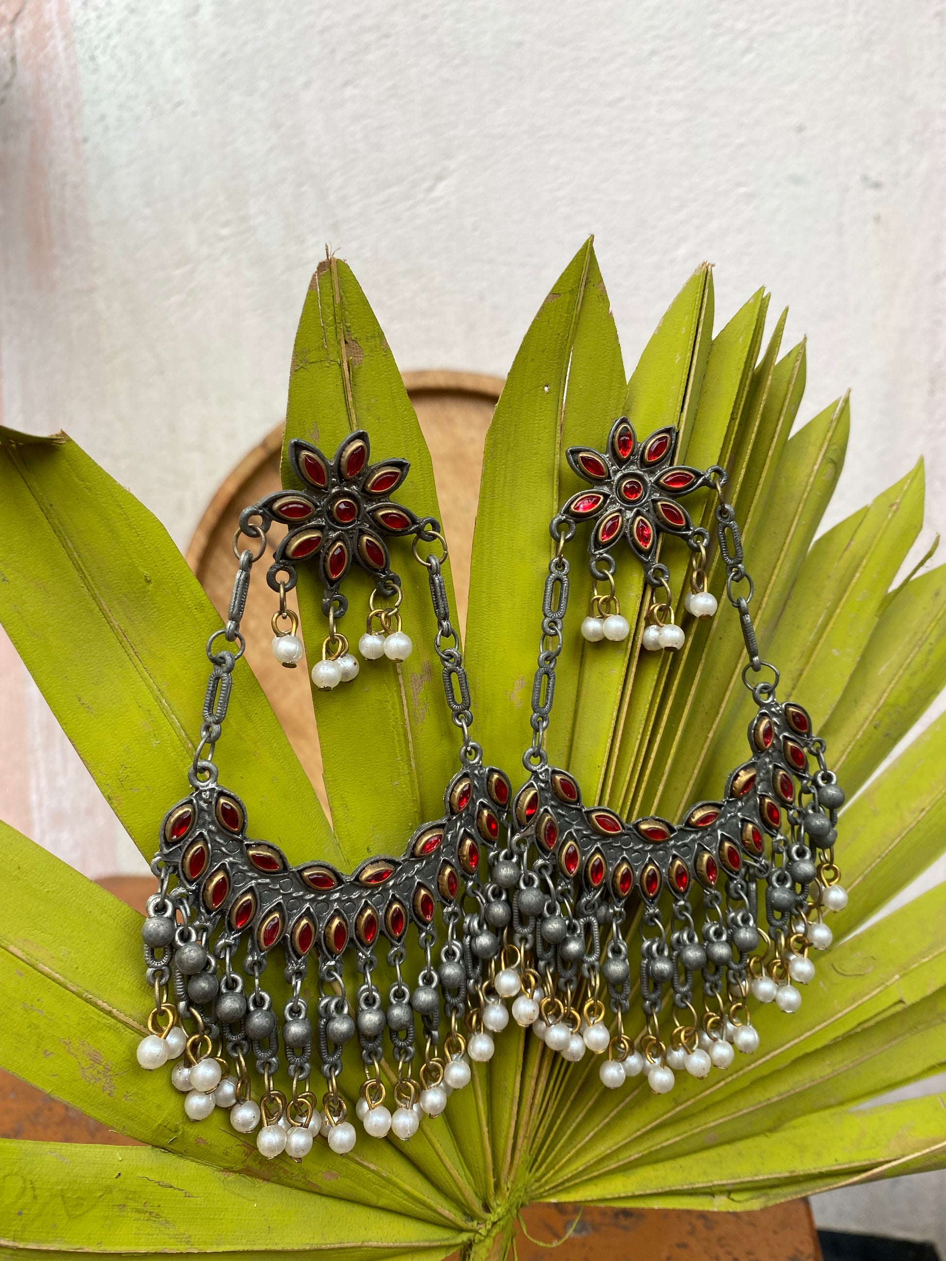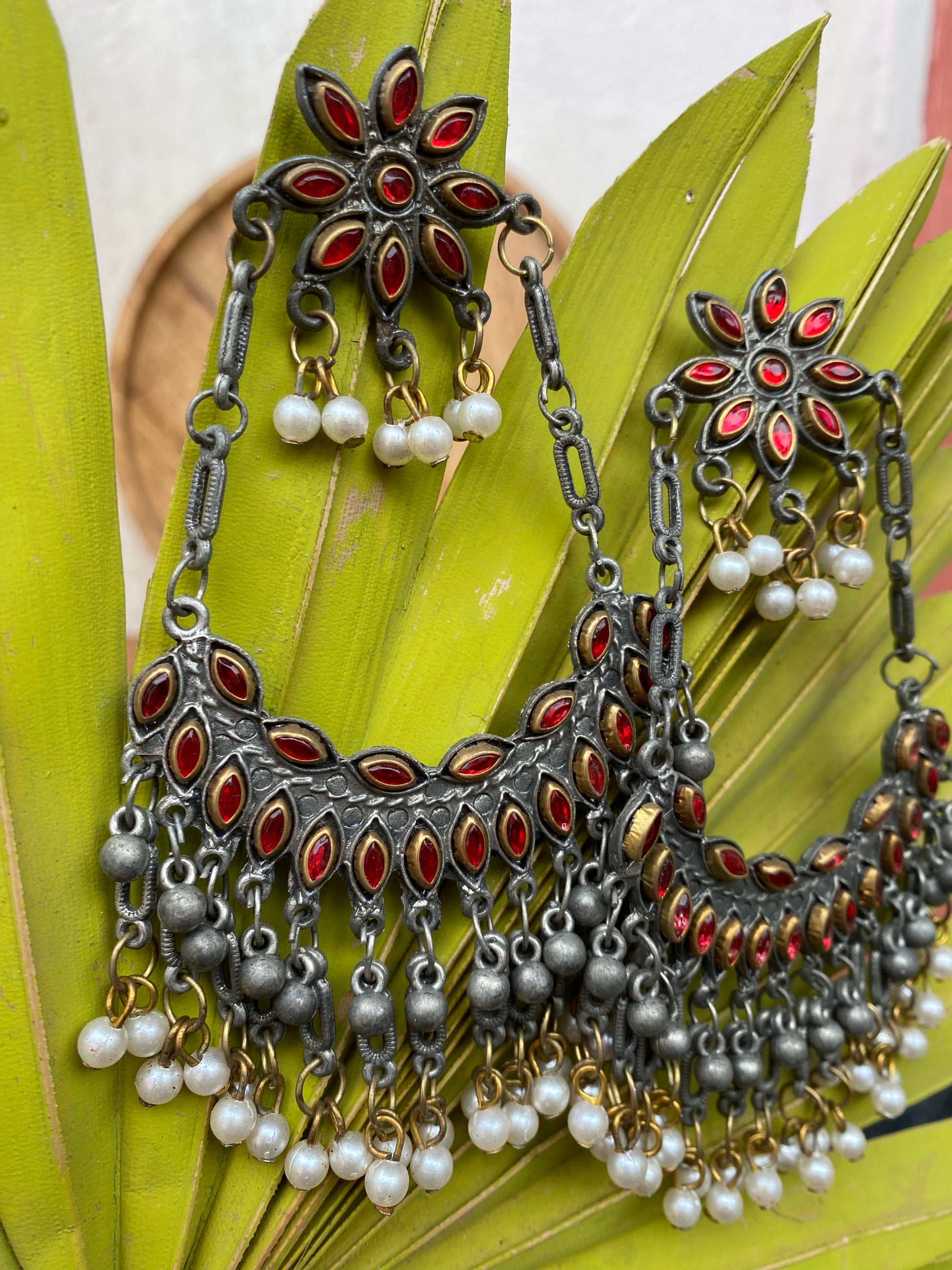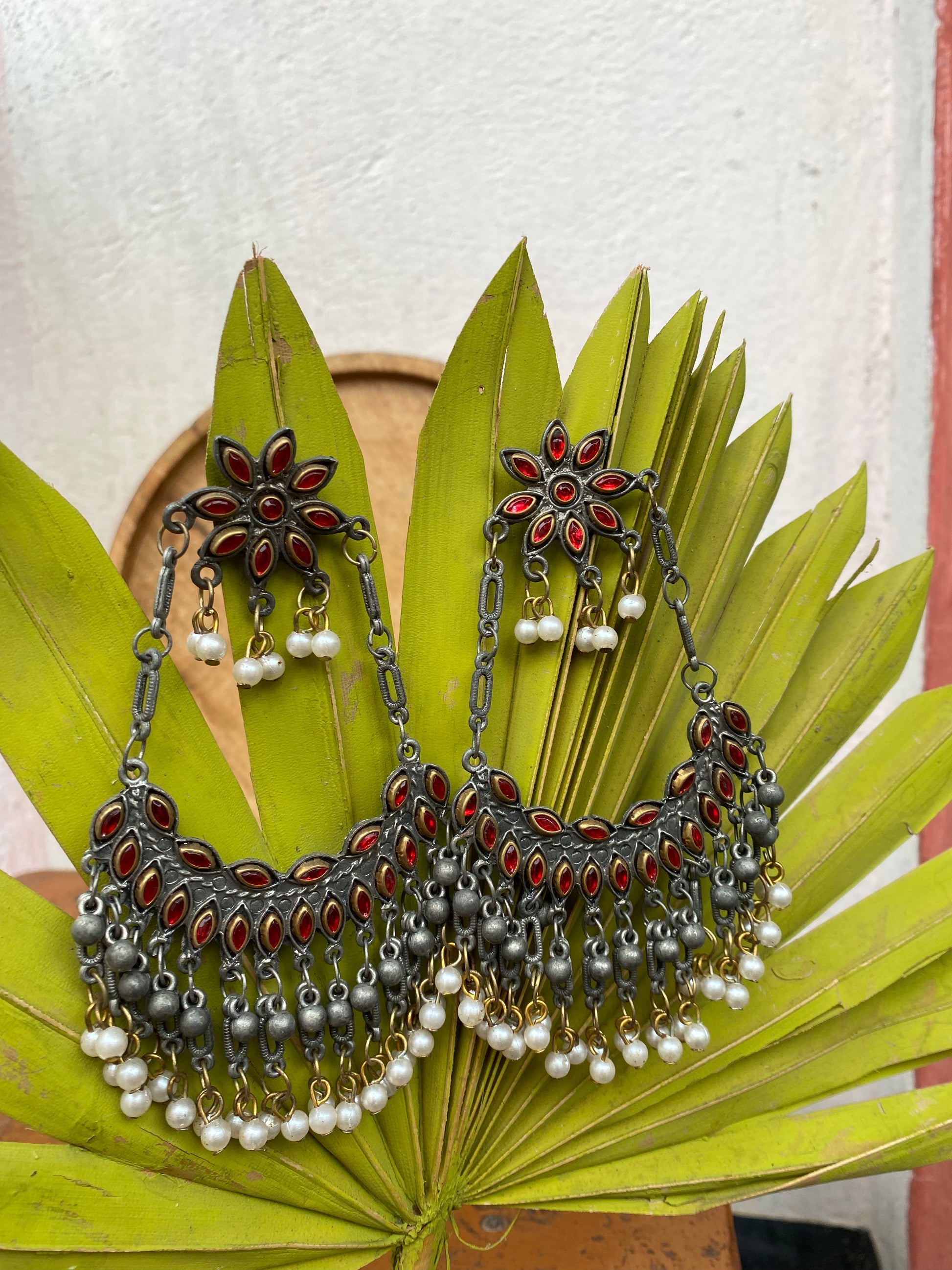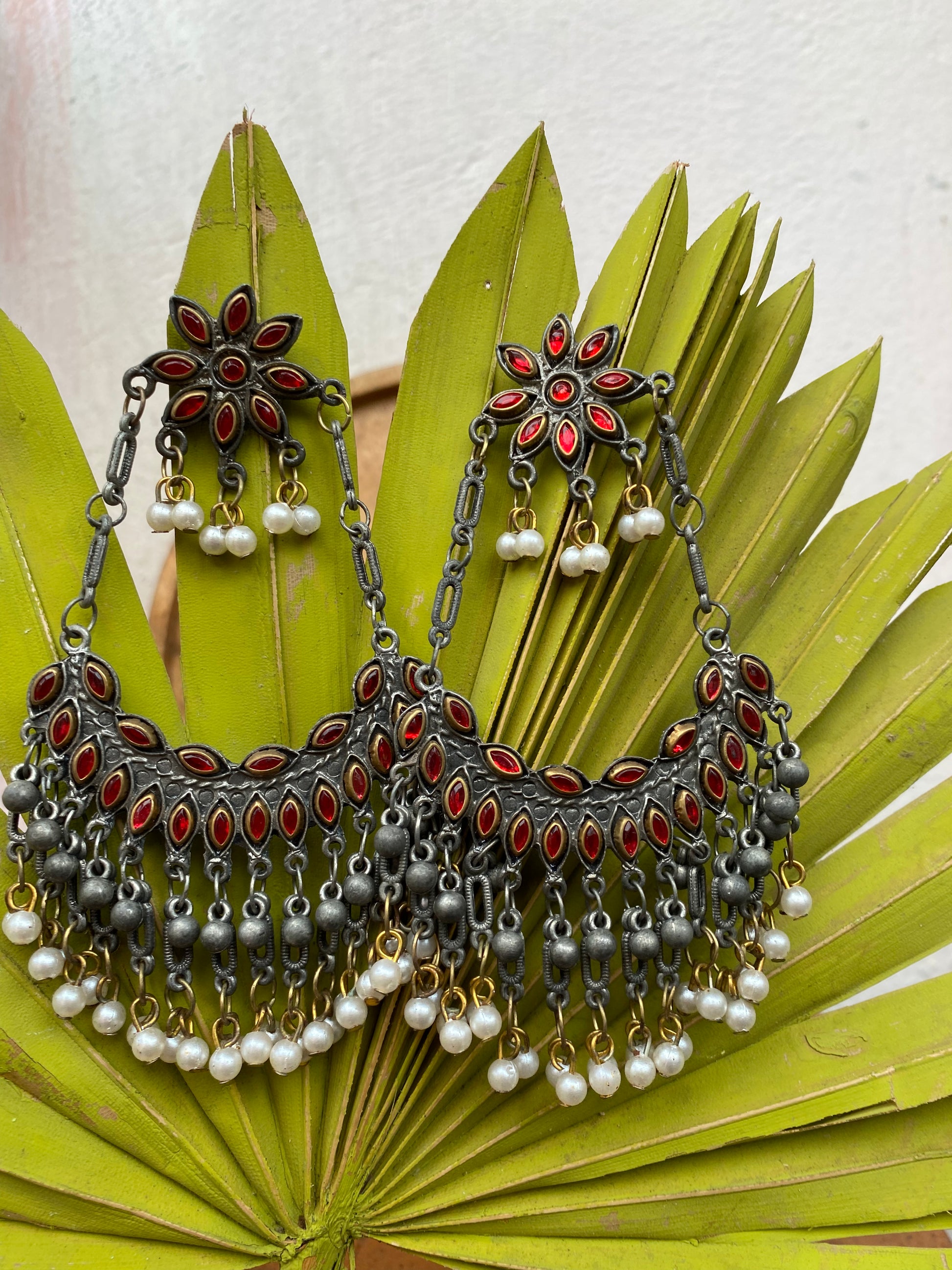 This distinctive pair of earrings upholds the craftsmanship of India's intricate design and architecture, handcrafted in an oxidized silver color it exudes desi charm. Pair it up with your favorite Indian or Indo-western attire for the desi feels. Note: Minor variations may occur due to the handmade nature of our items