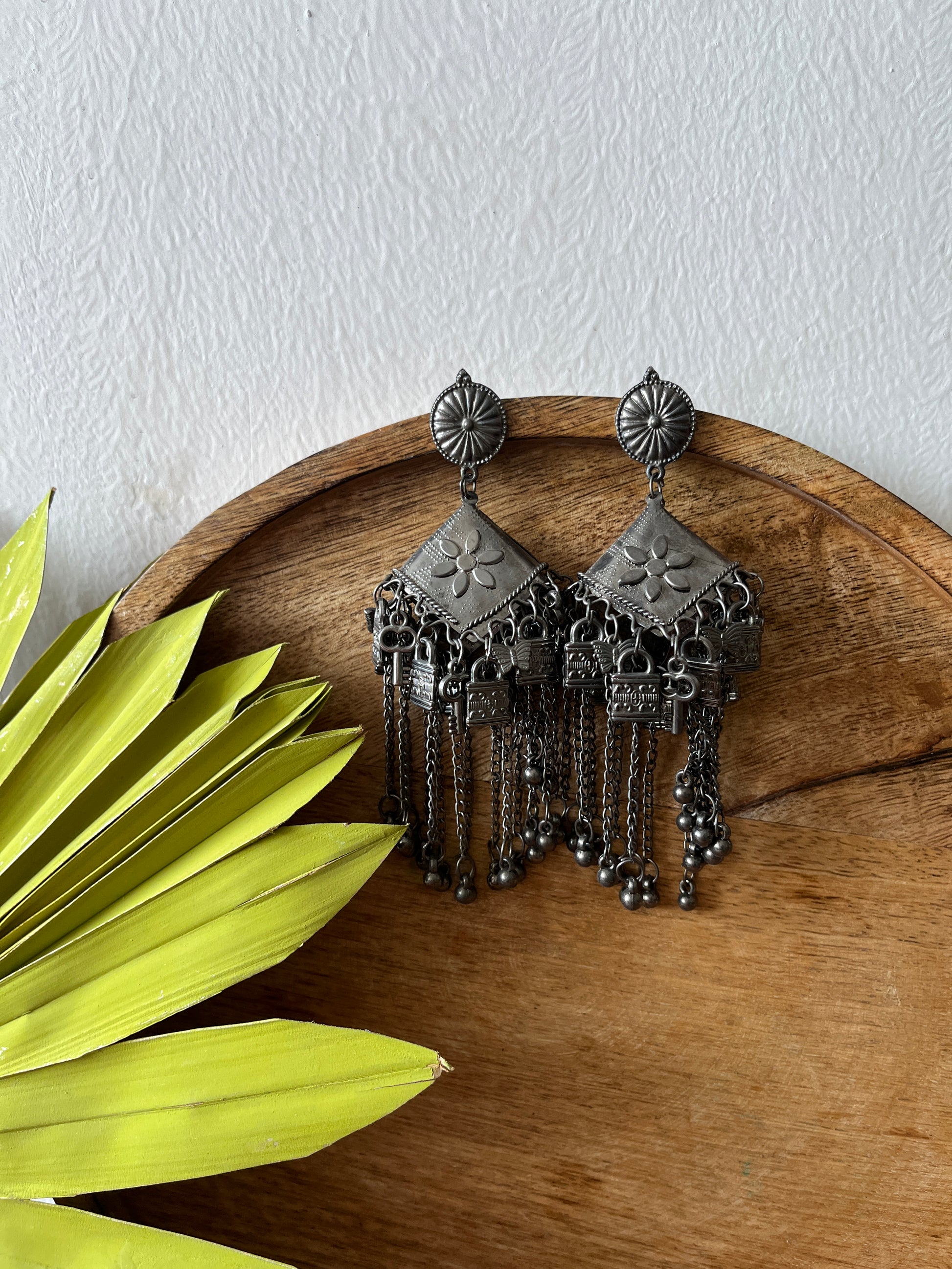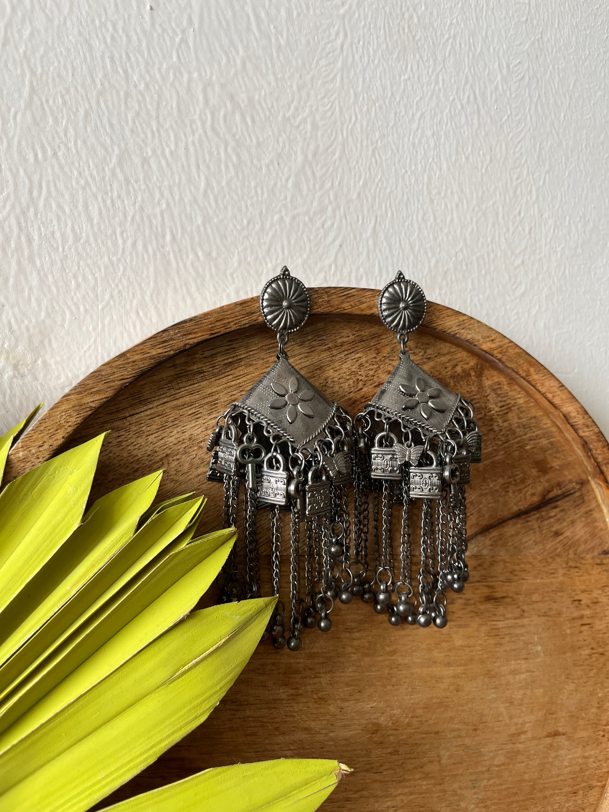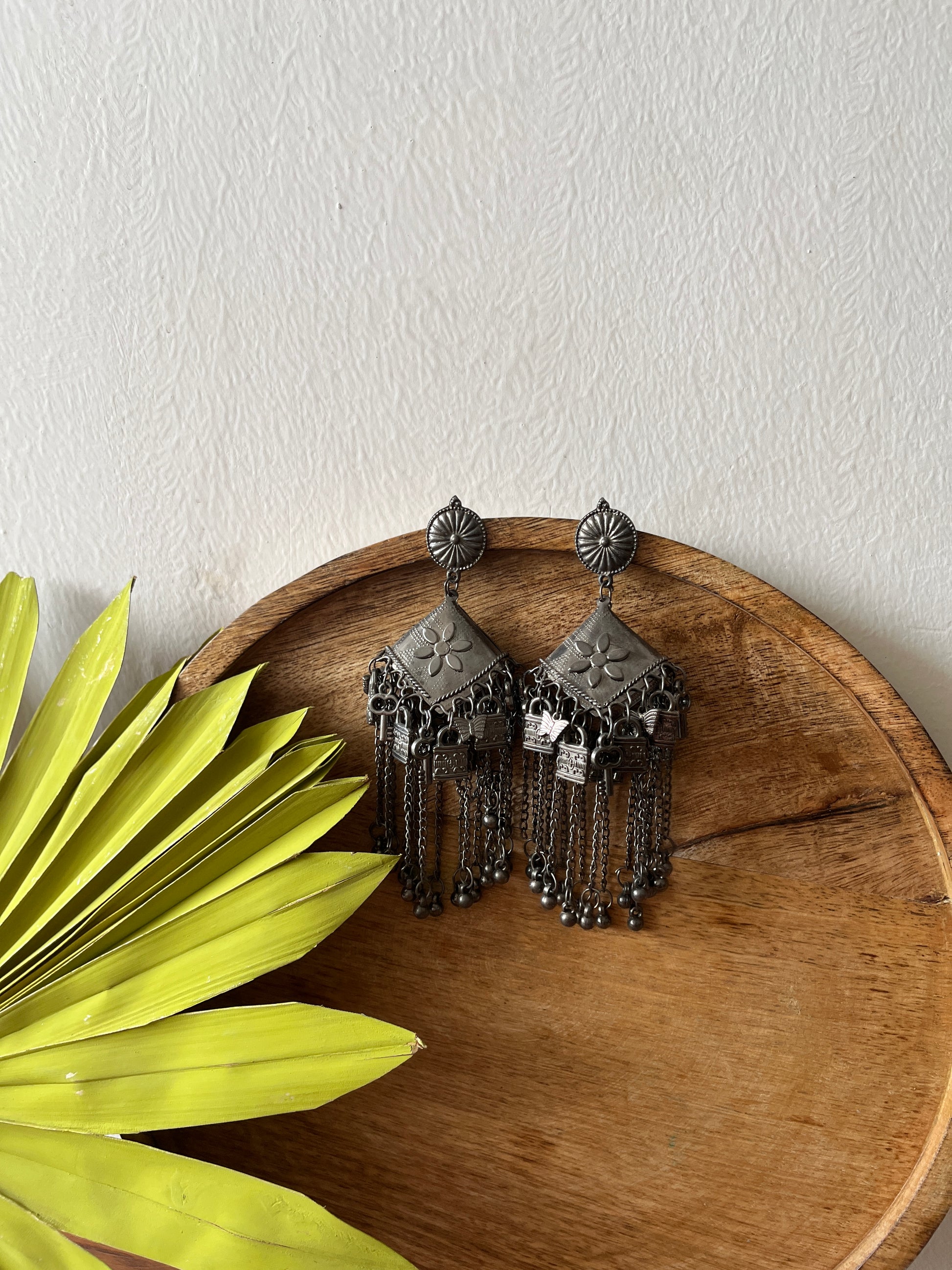 This distinctive pair of earrings upholds the craftsmanship of India's intricate design and architecture, handcrafted in a black oxidized silver color it exudes desi charm. Pair it up with your favorite Indian or Indo-western attire for the desi feels. Note: Minor variations may occur due to the handmade nature of our items