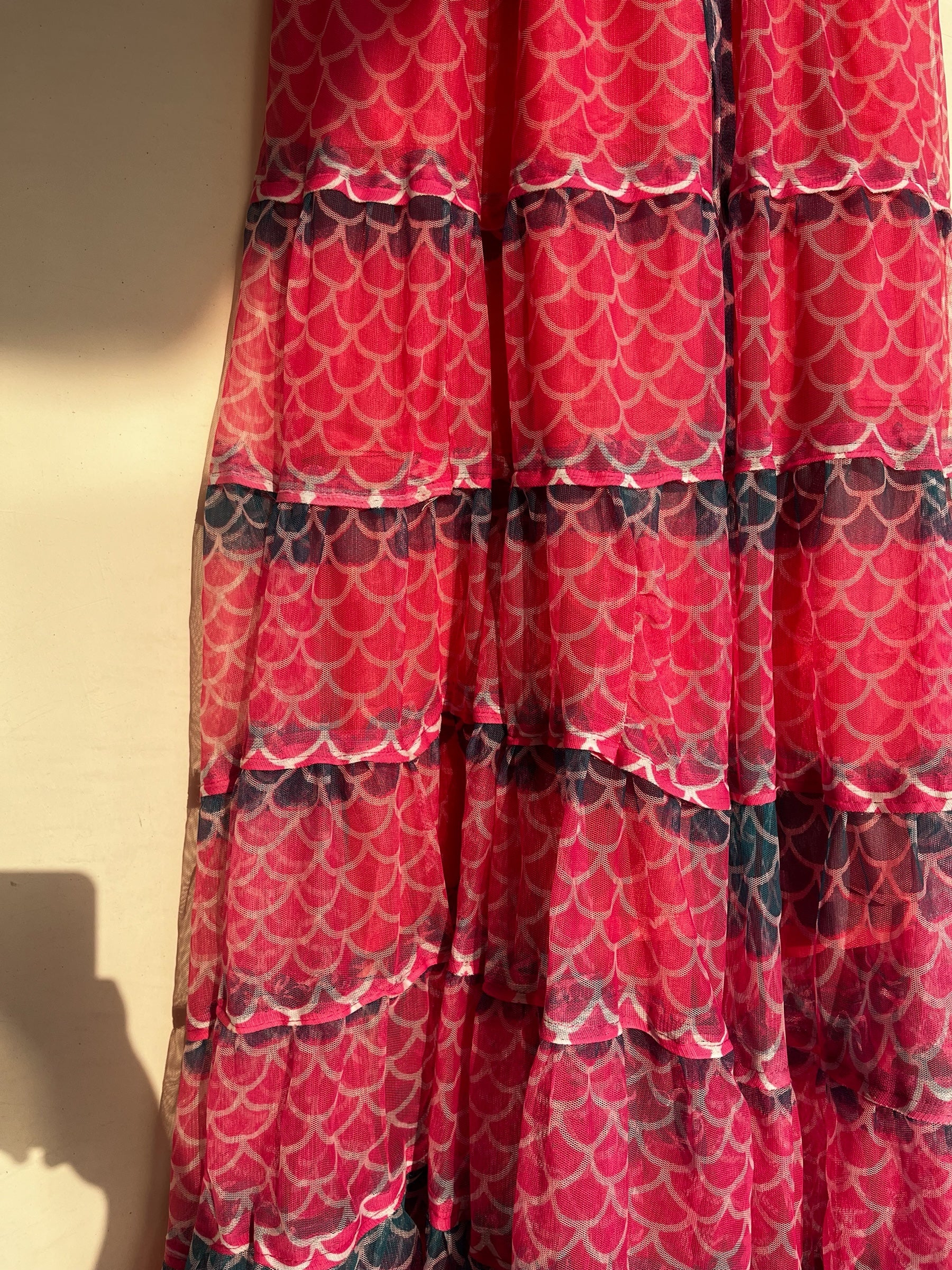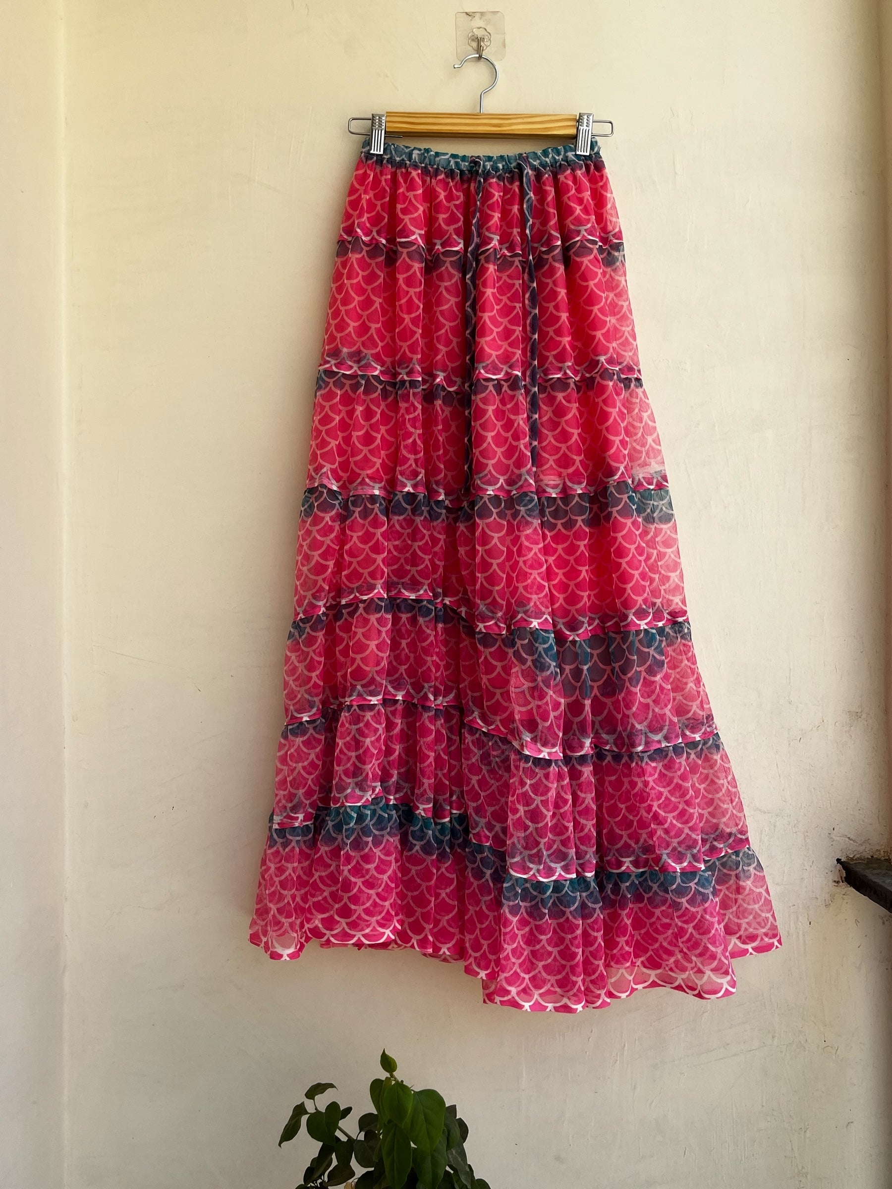 She is a mermaid disguised as a human; this skirt is in a beautiful bubblegum pink c colour with scallops