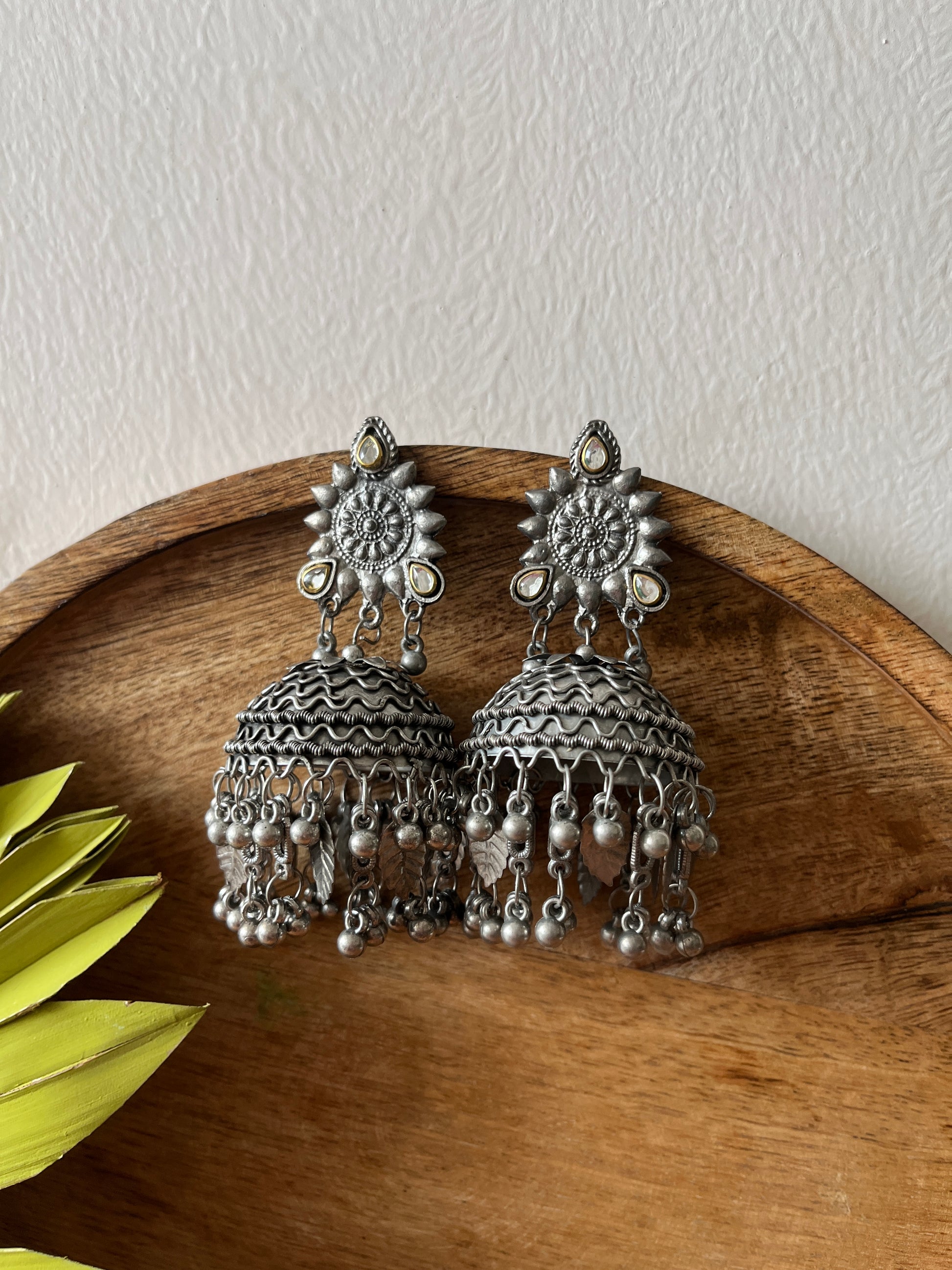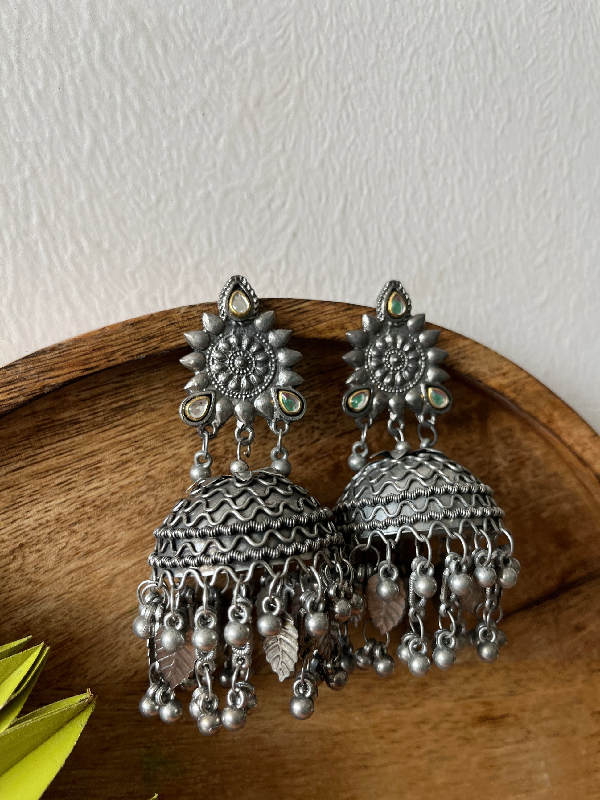 This distinctive pair of earrings upholds the craftsmanship of India's intricate design and architecture, handcrafted in an oxidized silver color it exudes desi charm. Pair it up with your favorite Indian or Indo-western attire for the desi feels. Note: Minor variations may occur due to the handmade nature of our items