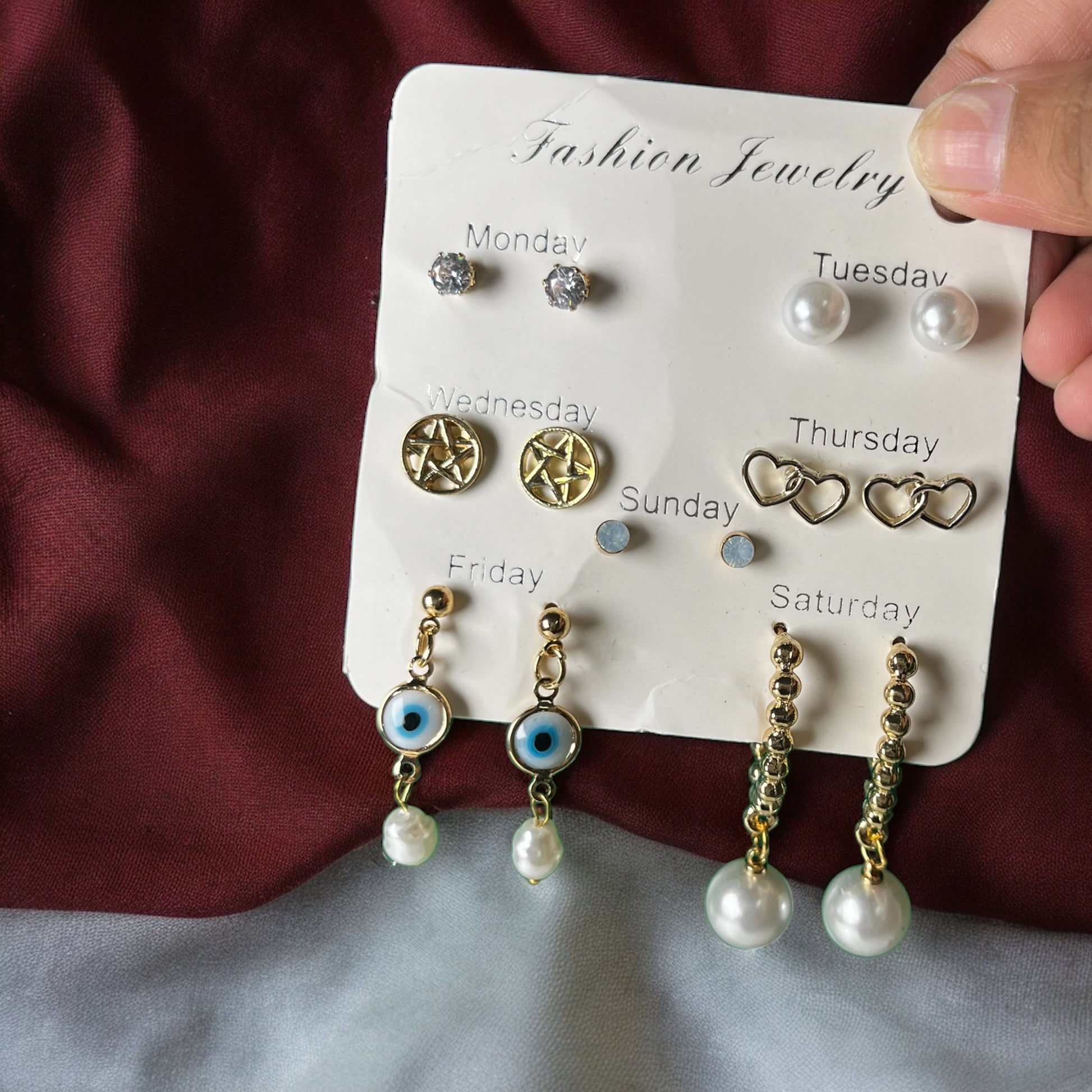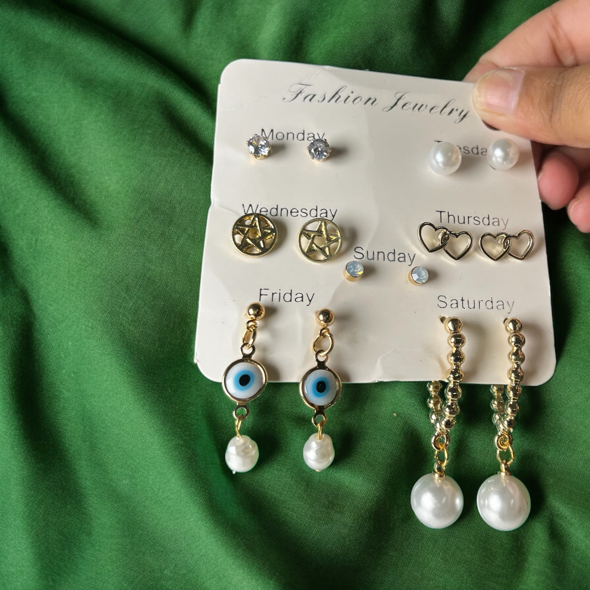 A beautiful combo of 7 earrings to suit your every day of the week style, from classy studs to elegant danglers, we promise you will look gorgeous everyday of the week