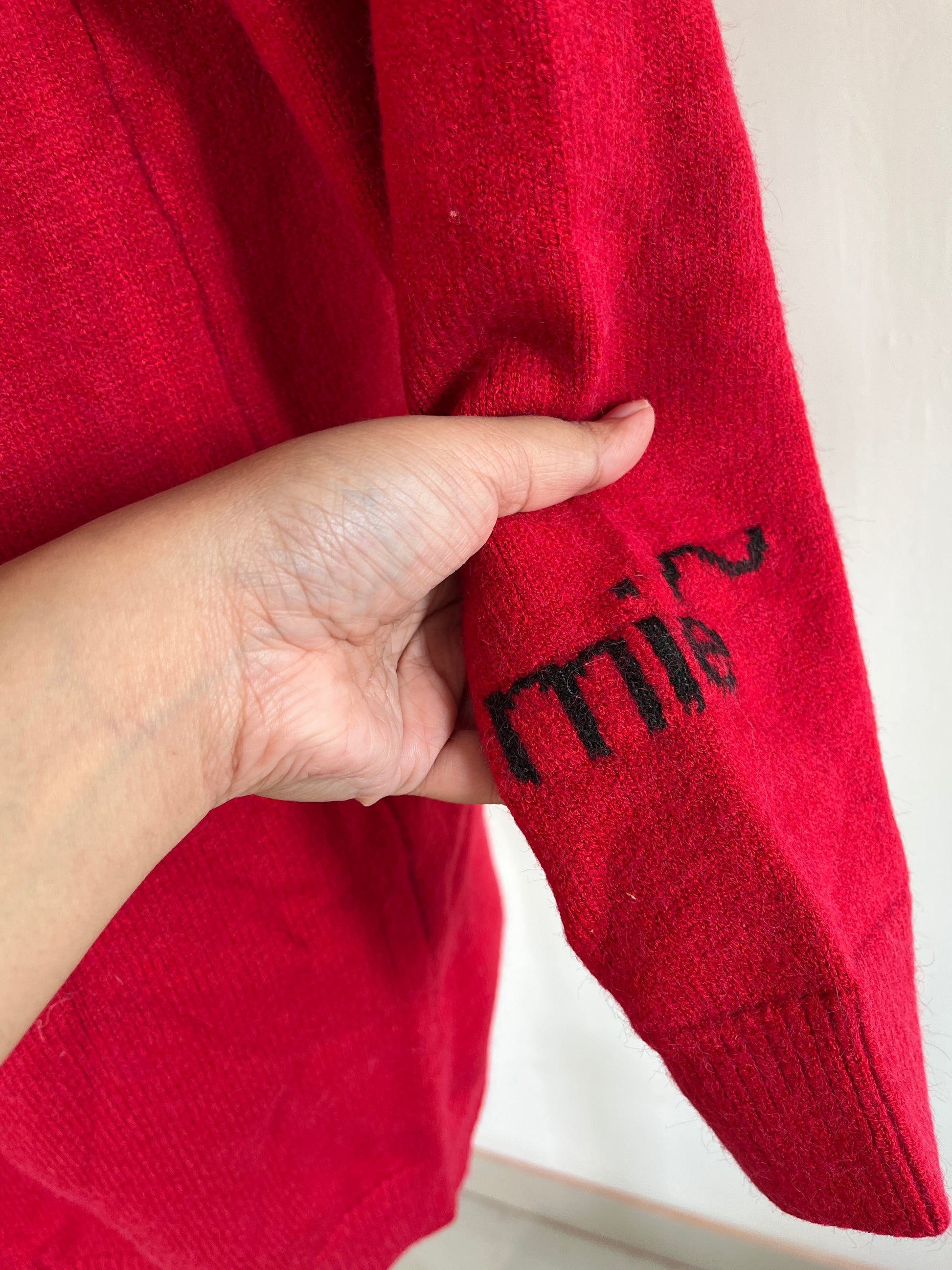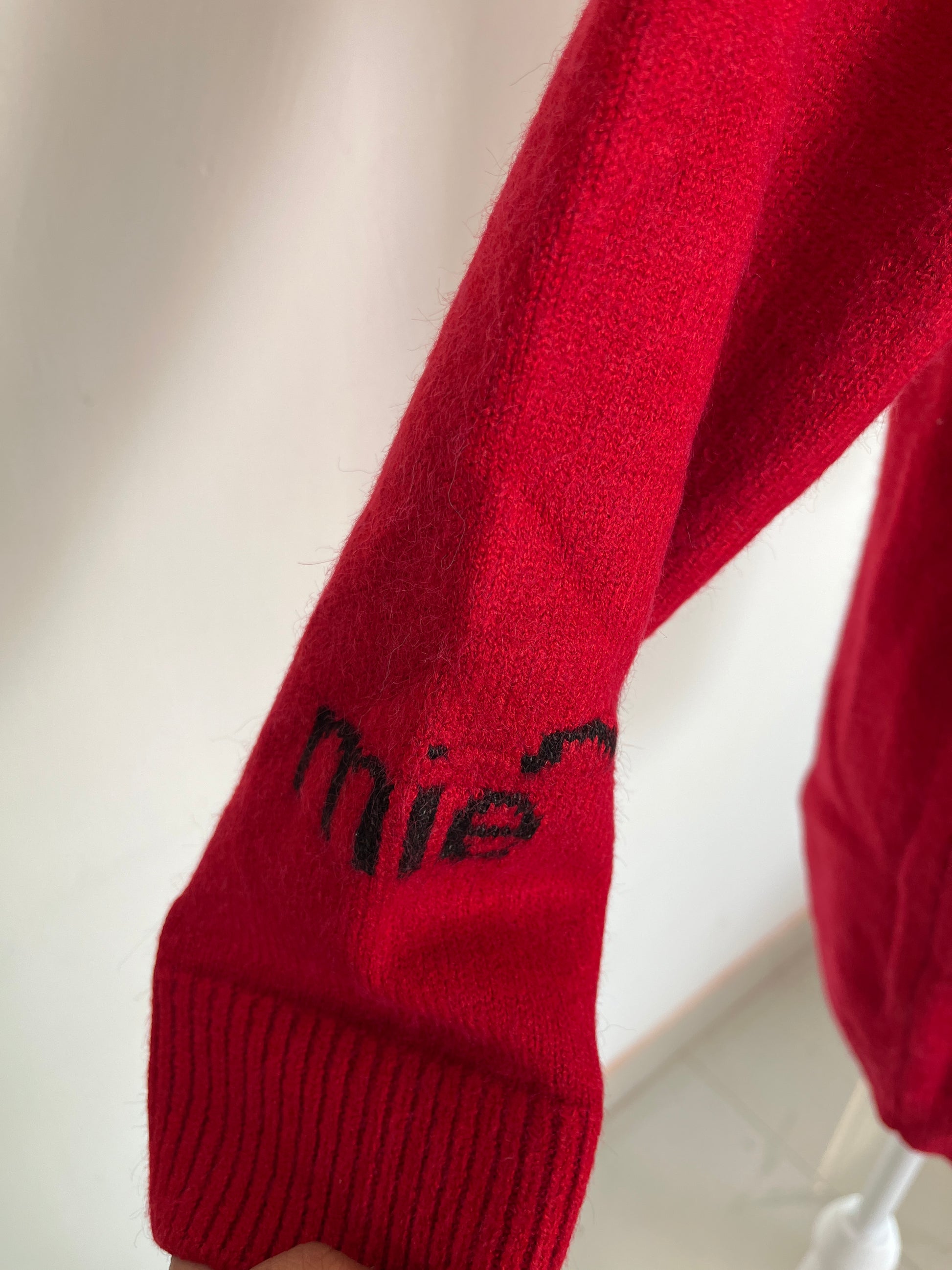 Soft red knit, high neck, and the cutest fuzzy sheep — this one’s playful, cozy, and impossible to ignore.
