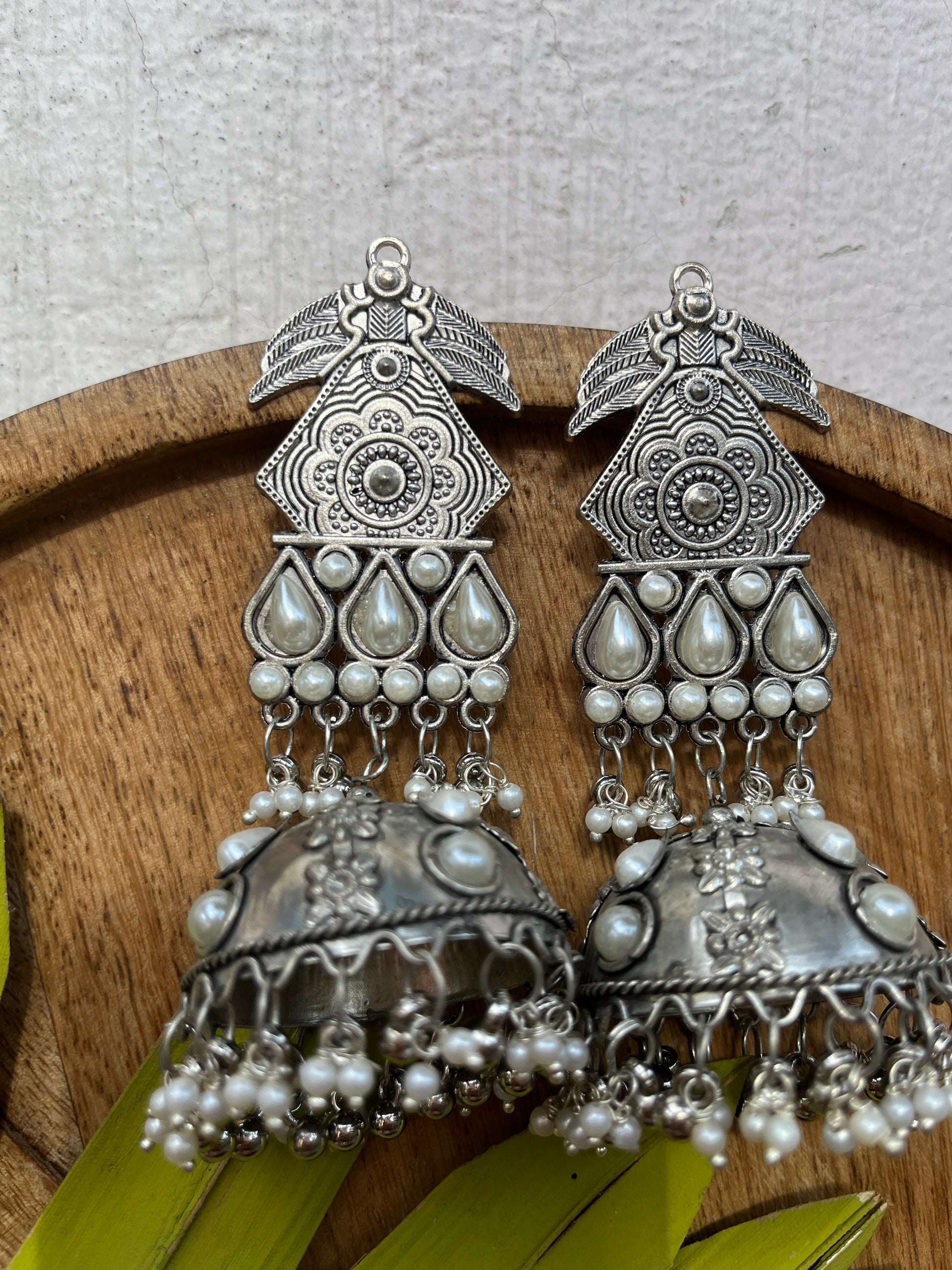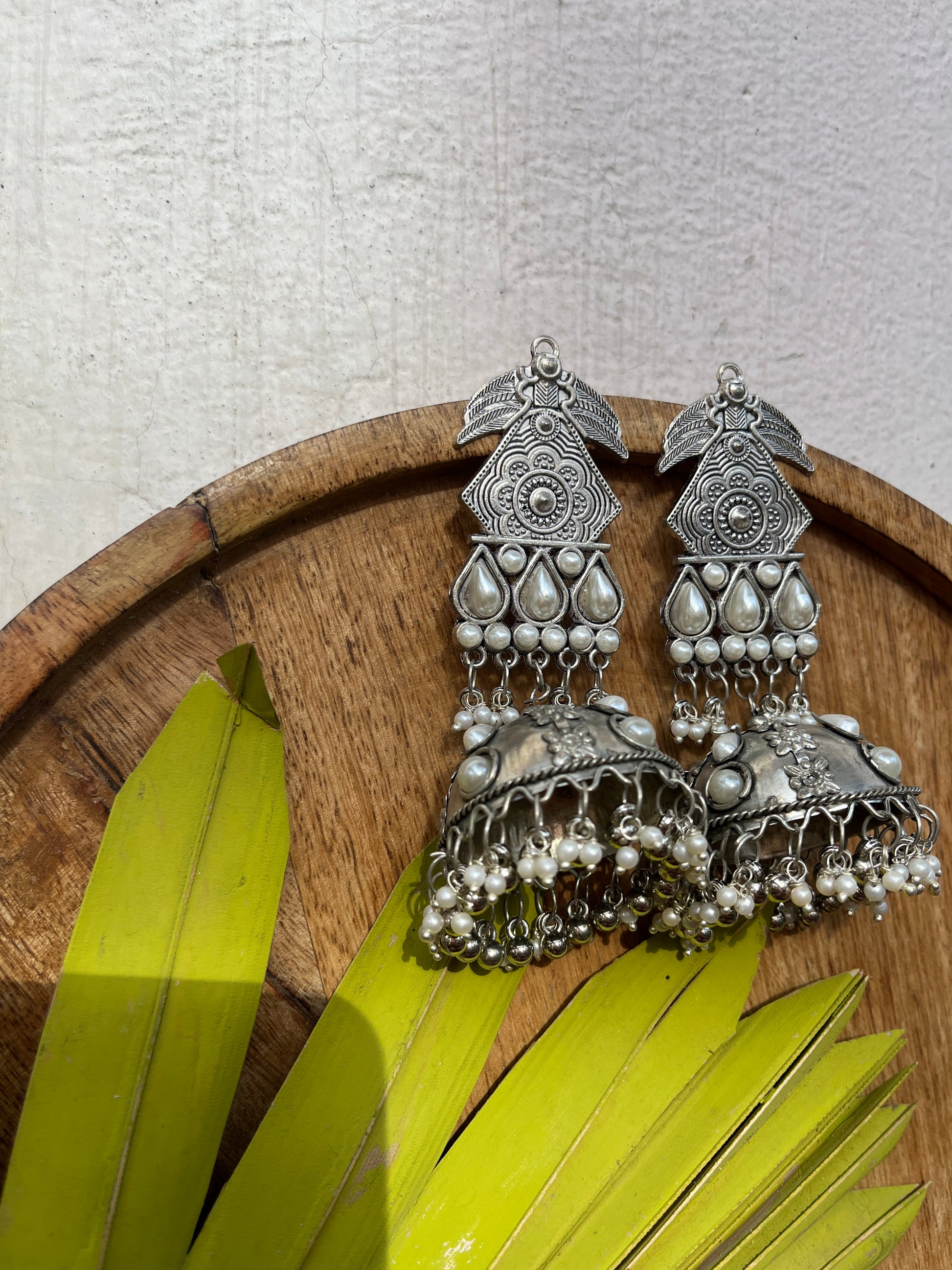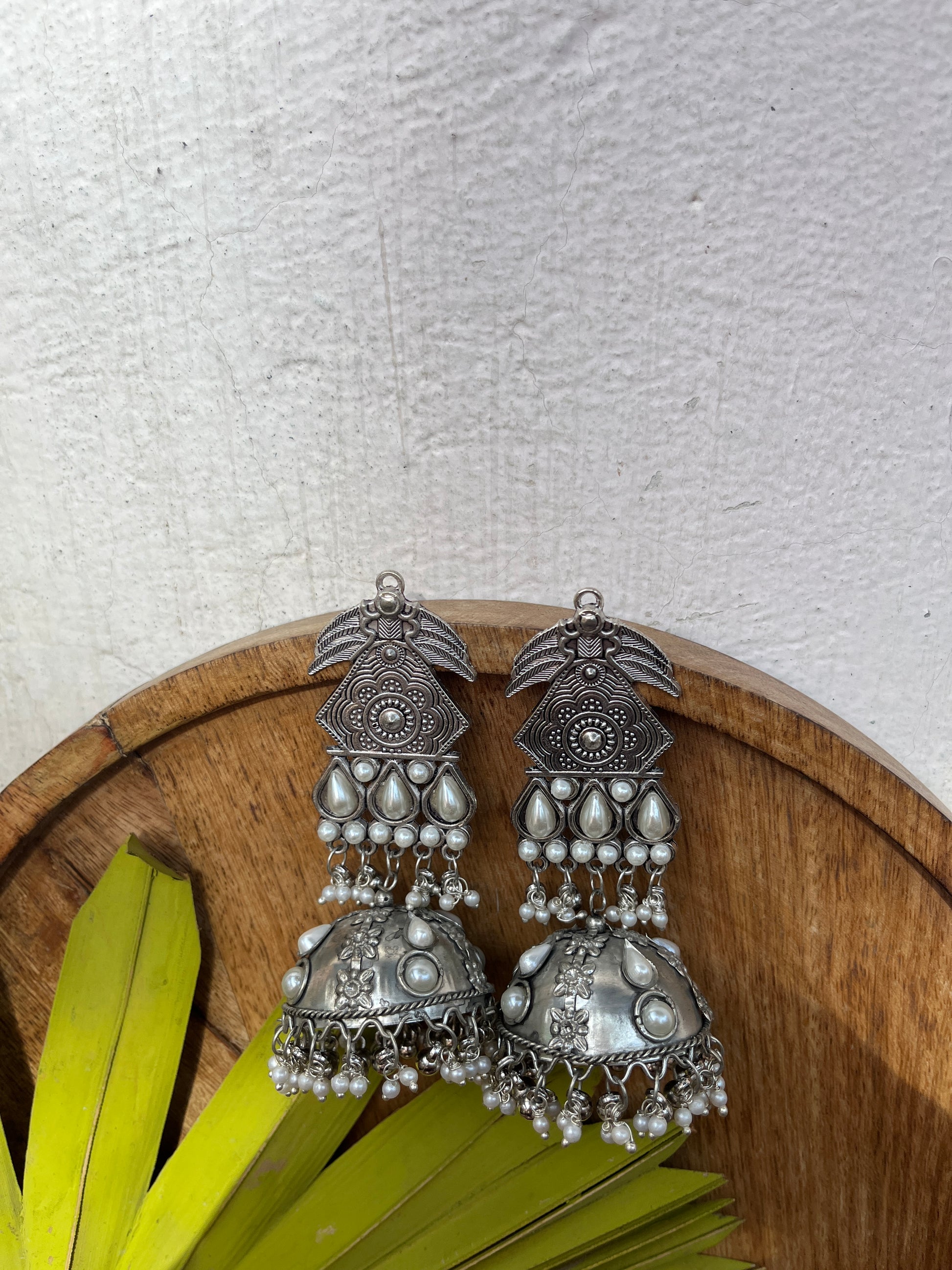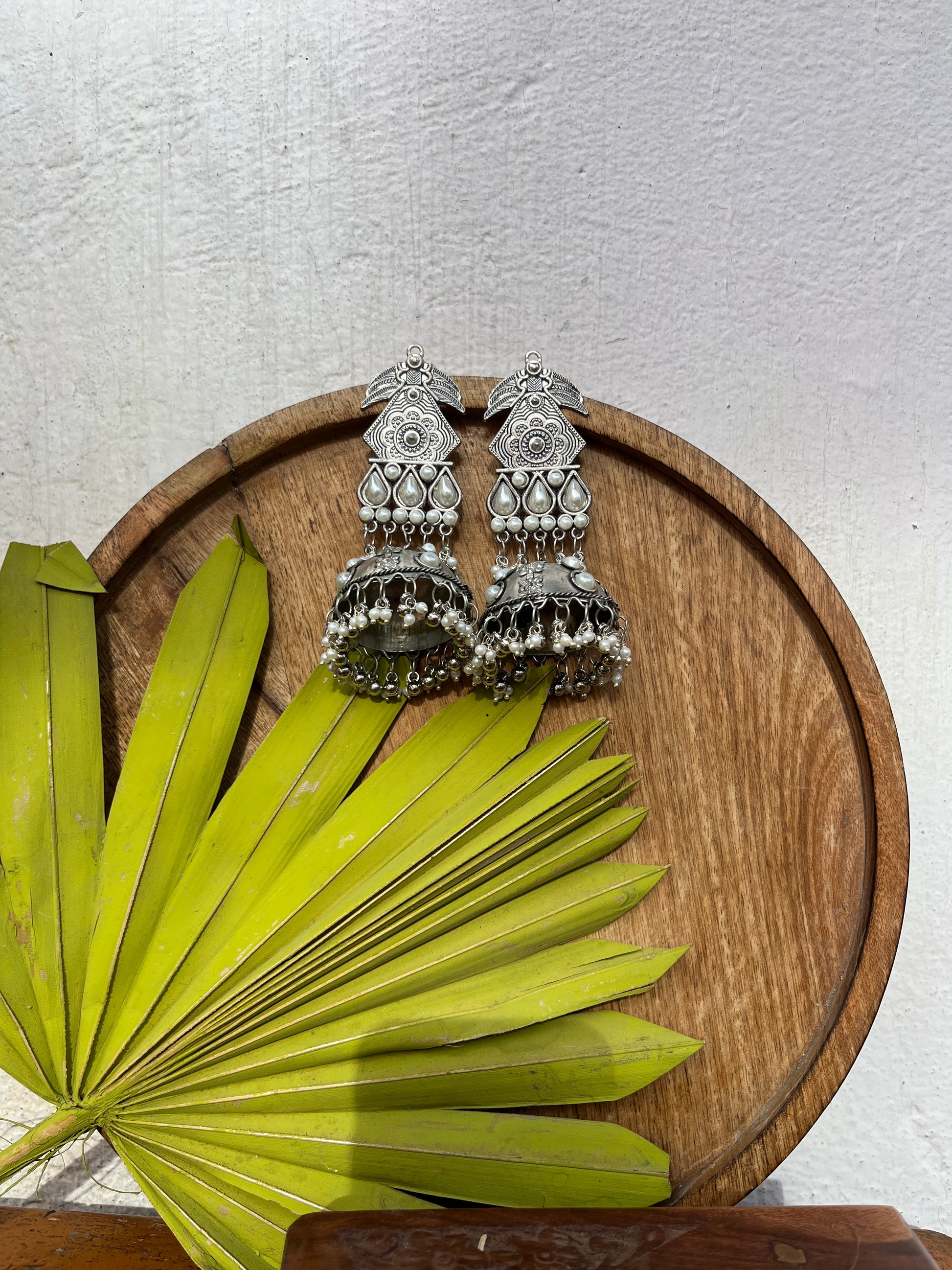 This distinctive pair of earrings upholds the craftsmanship of India's intricate design and architecture, handcrafted in an oxidized silver color it exudes desi charm. Pair it up with your favorite Indian or Indo-western attire for the desi feels. Note: Minor variations may occur due to the handmade nature of our items